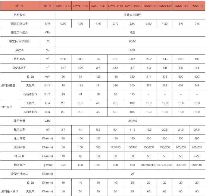 卧式常压热水锅炉技术参数: